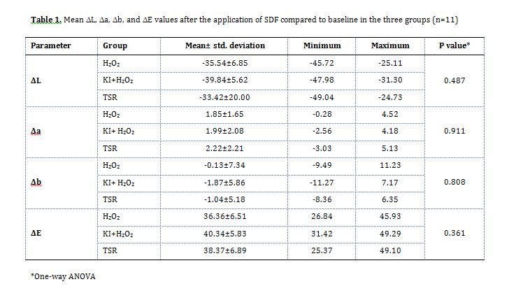 ∆E: The mean ∆E in the KI + H2O2 group was significantly lower than that in the H2O2 (P=0.001) and TSR (P<0.001) groups. The mean ∆E in the H2O2 group was significantly lower than that in the TSR group (P<0.001).