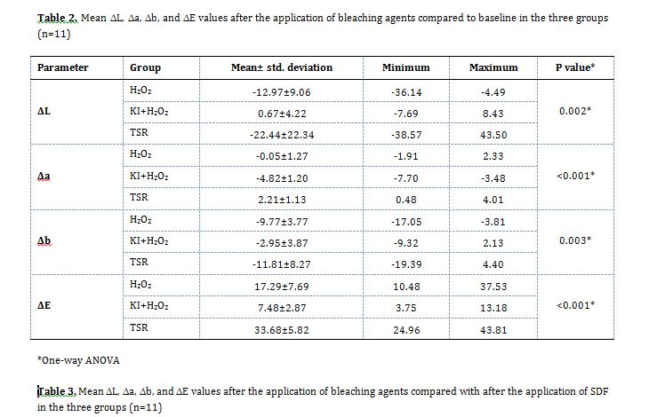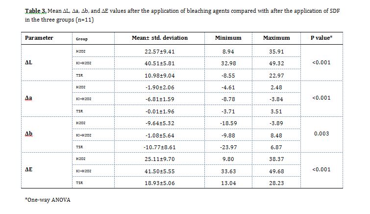 Materials and Methods: In this in vitro study, the buccal surface enamel of 33 sound premolars was artificially demineralized and exposed to 38% SDF. The specimens were then randomly assigned to 3 groups of (I) KI + H2O2 (application of water-soluble KI followed by 35% H2O2 on the discolored surface for 3 minutes), (II) H2O2 (application of 35% H2O2 for three 20-minute cycles), and (III) TSR (application of TSR for 3 minutes on the discolored surface). The color parameters were measured at baseline, 1 week after the application of SDF, and 1 week after the application of the abovementioned bleaching agents by a spectrophotometer. Data were analyzed by ANOVA and Tukey test (alpha=0.05).