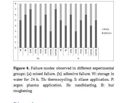 Figure 4. Failure modes observed in different experimental groups: (a) mixed failure, (b) adhesive failure. W: storage in water for 24 h, Th: thermocycling, S: silane application, P: argon plasma application, Sb: sandblasting, B: bur roughening