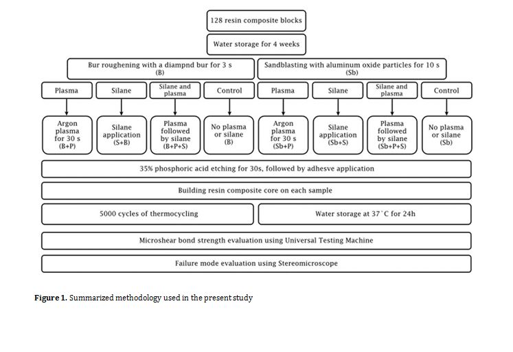 Materials and Methods: The current in vitro study utilized 128 composite specimens (10 x 10 x 10 mm) that were stored in 37°C water for 4 weeks and then randomly divided into two groups (n = 64) for surface treatment by sandblasting or bur roughening. Then, each group was divided into four subgroups (n=16) and received surface treatments as follows: No plasma or silane, plasma application, silane application, plasma and silane application. The new composite was then bonded to each specimen using G-Premio Bond. Half of each subgroup (n=8) underwent 5000 thermal cycles, while the other half was stored in water for 24 hours. Finally, the repair µSBS was measured. Four-way ANOVA was used for data analysis (alpha=0.05).
