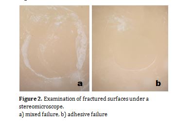 Figure 2. Examination of fractured surfaces under a stereomicroscope. a) mixed failure, b) adhesive failure