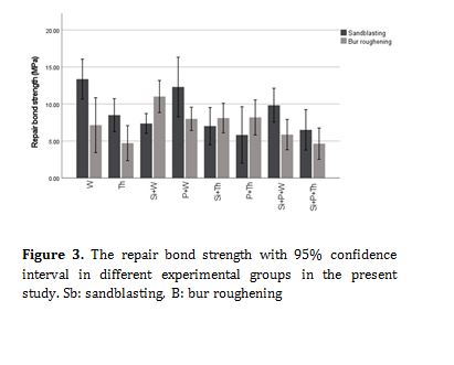 Figure 3. The repair bond strength with 95% confidence interval in different experimental groups in the present study. Sb: sandblasting, B: bur roughening