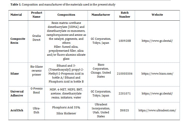 After chemical surface treatment, the surfaces were etched for 30 seconds using 35% phosphoric acid (Ultra-Etch; Ultradent Inc., Utah, USA). Then, the surfaces were rinsed and dried with a gentle air spray. Universal adhesive (G-Premio Bond; GC Corp., Tokyo, Japan) was applied according to the manufacturer's instructions, and a uniform layer of adhesive was applied on each specimen surface. The adhesive was kept undisturbed for 10 seconds, followed by 5 seconds of drying with maximum air pressure and 10 seconds of light curing. Table 1 summarizes the composition and manufacturers of the materials used in the present study.