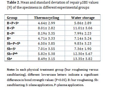 Table 2. Mean and standard deviation of repair µSBS values (N) of the specimens in different experimental groups