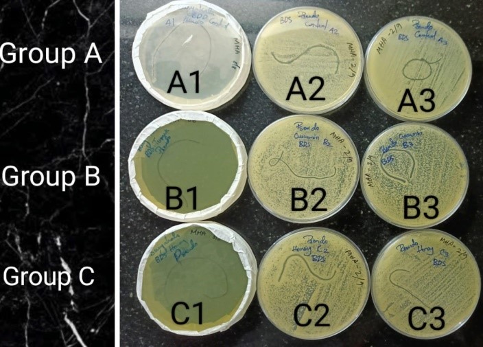 In P. aeruginosa culture, the diameter of the growth inhibition zone was 0 mm in group A, 1 mm, 4 mm, and 5 mm in the three samples of group B, and 1 mm, 3 mm, and 4 mm in the three samples of group C (Figure 4). There was no difference in antibacterial efficacy between the plain and honey groups (P=0.604), but a statistically significant difference was observed between the plain and curcumin groups (P=0.034) in P. aeruginosa culture (Table 2).