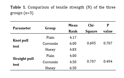 Materials and Methods: This in vitro study included three groups (n=3). Group A consisted of plain silk sutures, group B consisted of silk sutures coated with curcumin, and group C consisted of silk sutures coated with honey extract. Morphological assessment was performed using scanning electron microscopy (SEM) and energy dispersive spectroscopy (EDS). Tensile strength was measured using straight-pull and knot-pull tests on a tensile tester, and antimicrobial efficacy was evaluated using antimicrobial culture tests for the three groups. Statistical analysis was carried out using SPSS version 22.0.