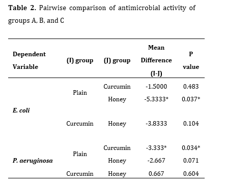 Similarly, in E. coli culture, the diameter of the growth inhibition zone was 0 mm in group A, 0.5 mm, 1 mm, and 3 mm in the three samples of group B, and 3 mm, 3 mm, and 10 mm in the three samples of group C.  There was a statistically significant difference in antibacterial activity of the plain and honey groups (P=0.037), but not between the plain and curcumin groups (P=0.483) against E. Coli (Table 2).