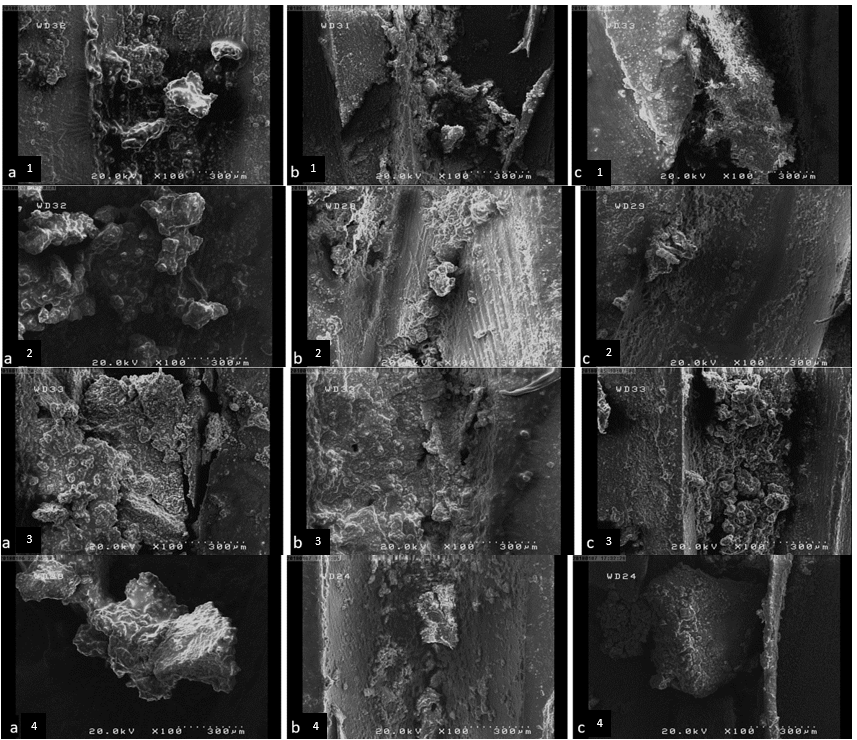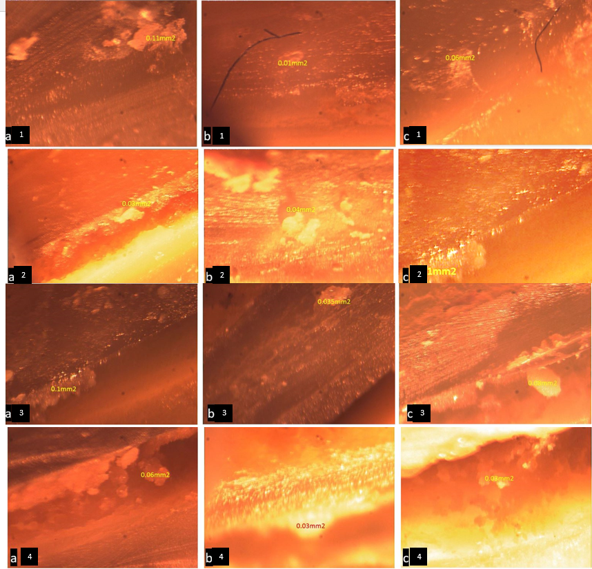 Figure 1 shows the SEM photomicrographs, and Figure 2 shows the stereomicroscopic photomicrographs of the root dentinal walls in different groups.