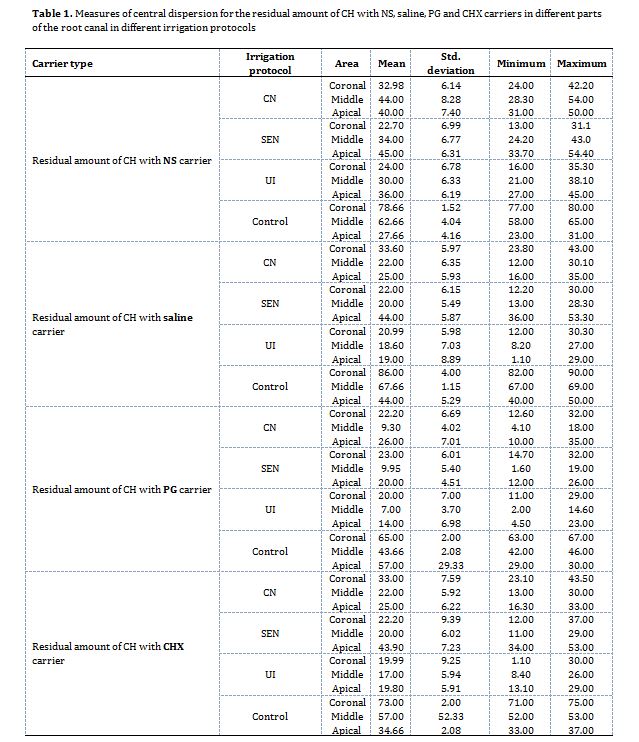 Table 1 presents the measures of central dispersion for the residual amount of CH with different carriers in different parts of the root canal system in different irrigation protocols.
