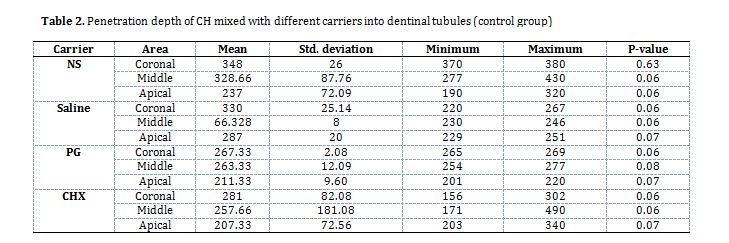 Concerning the penetration depth of CH, no significant difference was noted in the present study among different carriers despite their differences in molecular properties, size of particles, and surface tension. Due to the nano-scale particle size [38], NS was expected to have greater penetration depth than other carriers. Also, PG, due to its high surface tension, was expected to have greater penetration depth; however, no significant difference was observed in this regard among the groups. Similarly, Kranz et al. [29] found no significant difference in penetration depth of CH with PG and distilled water carriers. Also, Teja et al. [39] reported similar penetration depth of CH, and nano-CH into dentinal tubules. The present study confirmed the results of the abovementioned two studies.