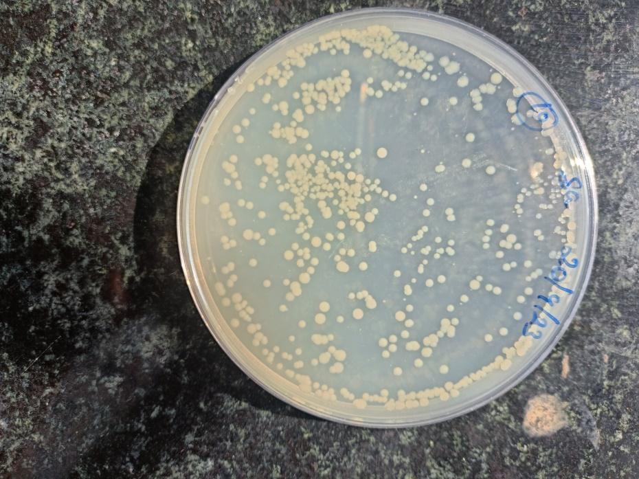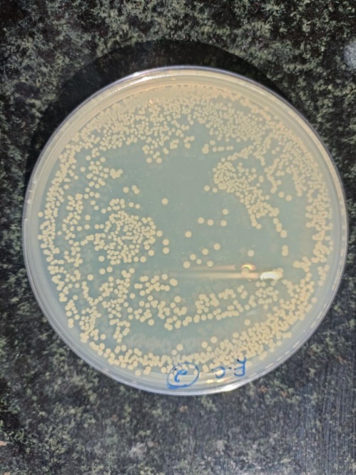 Antimicrobial testing was conducted by placing bacterial cultures of E. coli and S. aureus onto the bioglass samples. The growth inhibition was assessed through colony counting after incubation at 37°C for 24 hours. Initial bacterial counts before treatment were approximately 200,000,000 CFUs. After incubating with Eu-doped bioglass, bacterial growth was reduced by approximately 70-80% for E. coli, and 80-85% for S. aureus, as shown in Figures 3 and 4.